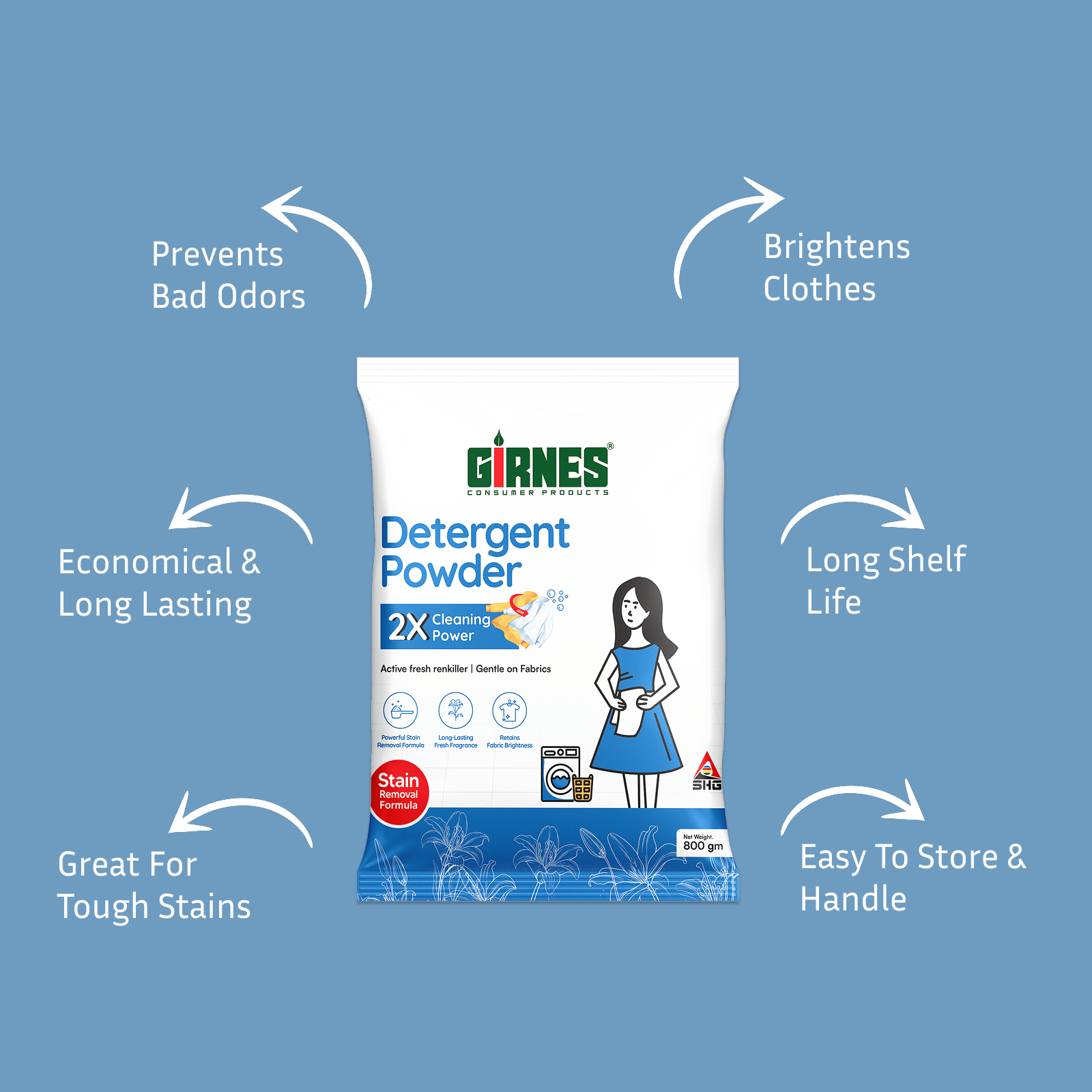 Girnes Detergent Powder works as a “Complete Laundry Protector”, ensuring your clothes stay clean, fresh, bright and comfortable.