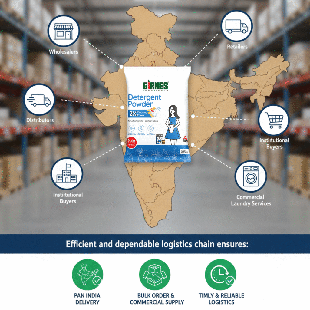 Girnes Detergent Powder is supplied across India through our strong and expanding distribution network.